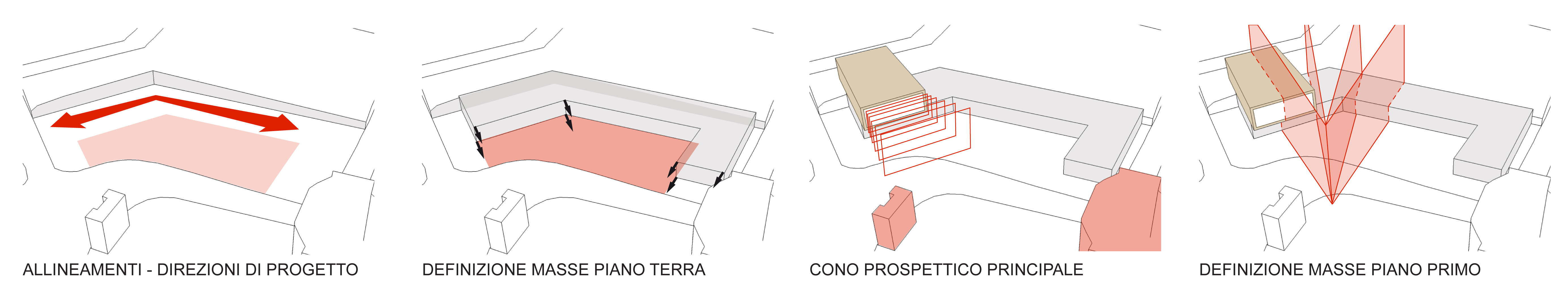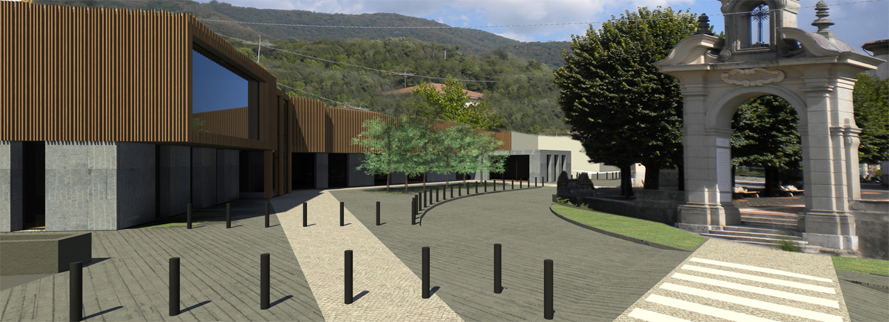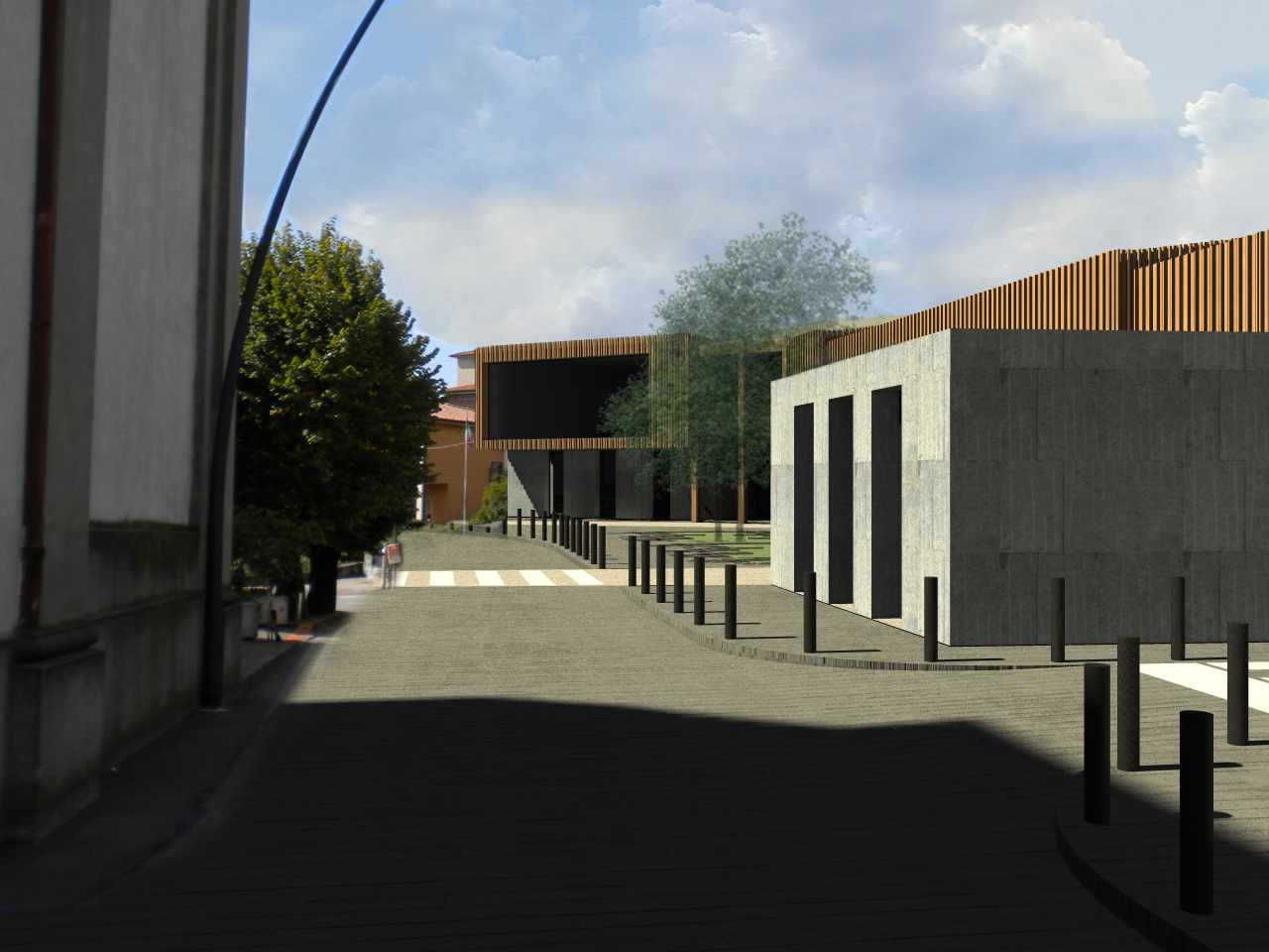 Letti i segni principali del territorio, il progetto si pone come obiettivo quello di creare una piazza che si integri col sistema degli spazi aperti esistenti, considerando l’ambiente urbano come fosse composto da diverse stanze tra loro interconnesse, portando l’intimità dell’interno all’esterno. Ciò anche per calarsi nella misura prevalente percepita in Cenate, cioè “’l’uomo”. Si vorrebbe far sentire a proprio agio i cittadini nella loro nuova piazza, stimolando così un maggiore senso di appartenenza alla comunità. Il nuovo edificio si porrà come nuovo riferimento per Cenate e il suo linguaggio architettonico dovrà esprimere la autorevolezza tipica degli edifici delle amministrazioni pubbliche italiane, conservando allo stesso tempo le proporzioni equilibrate col contesto. L’edificio progettato si ancora al terreno mediante il blocco del piano terra, un volume continuo, pensato come estrusione della roccia sedime di progetto e secondo le linee direttrici, matrici del tessuto urbano preesistente. Questa strategia permette di liberare la porzione di lotto adiacente al sagrato della chiesa, che sarà legata ai nuovi spazi aperti, delineando così il nuovo centro di Cenate Sopra. Il piano primo è generato a partire dal volume destinato ad auditorium e sala consiliare, una sorta di cannocchiale puntato verso il fulcro del paese. A ventaglio si dispongono poi gli altri volumi che spiccano dal basamento, come il profilo del restrostante gruppo del Monte Misma.