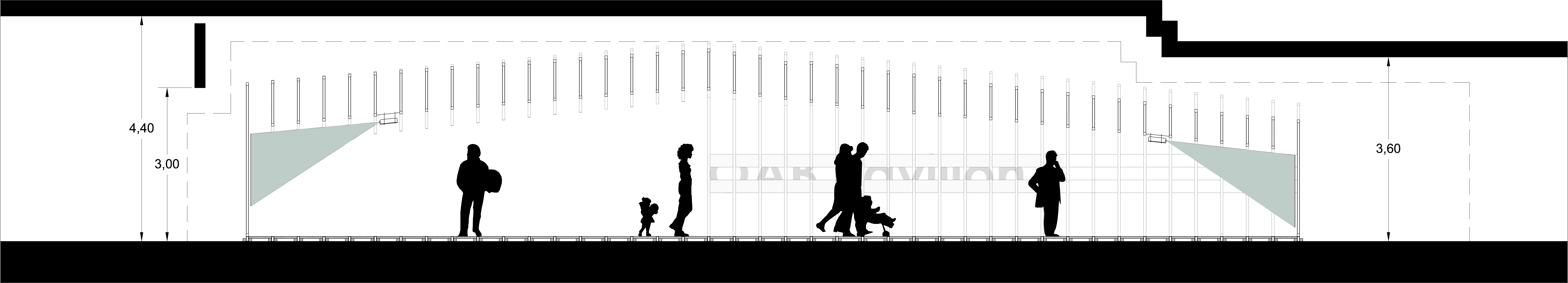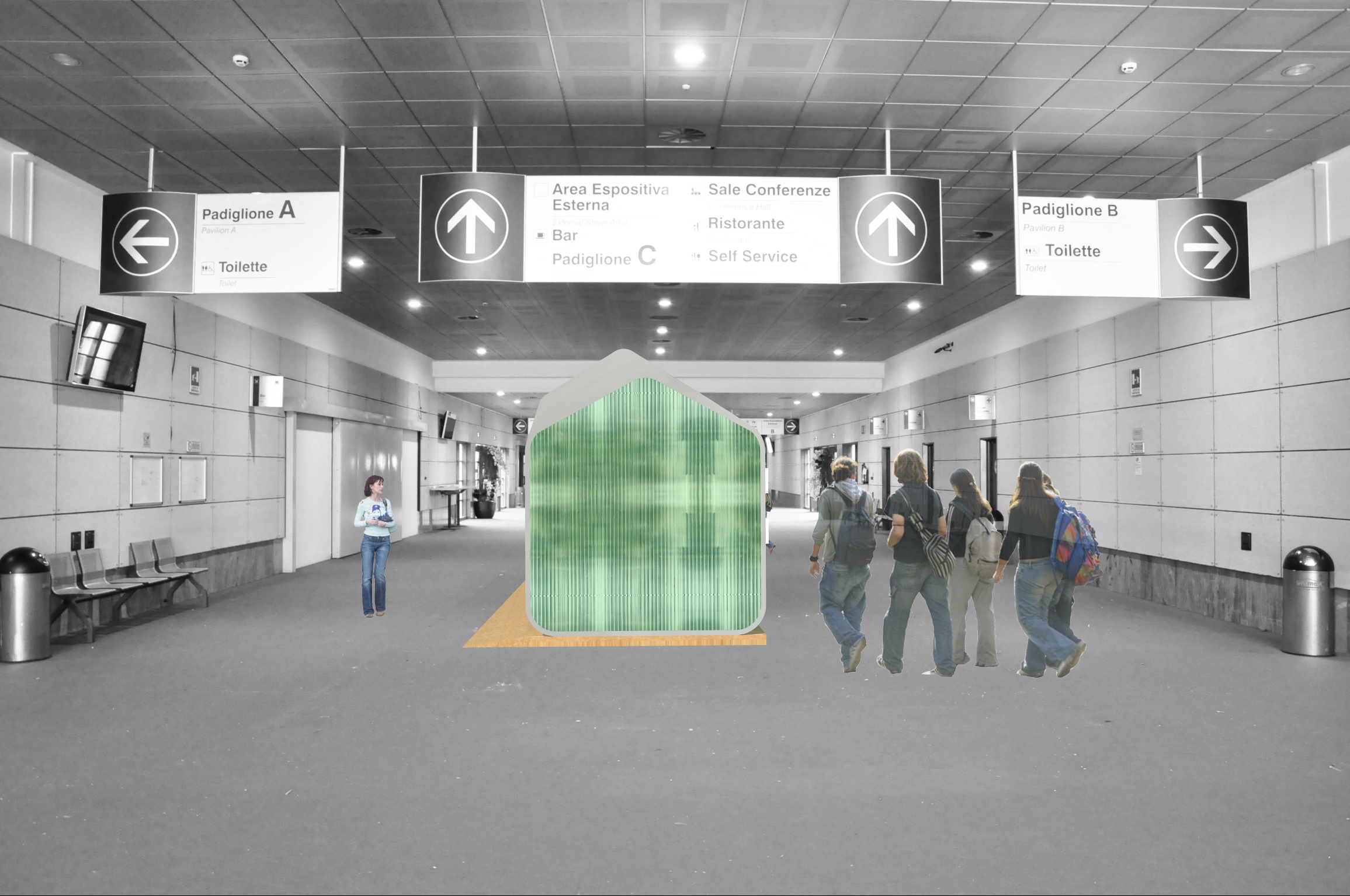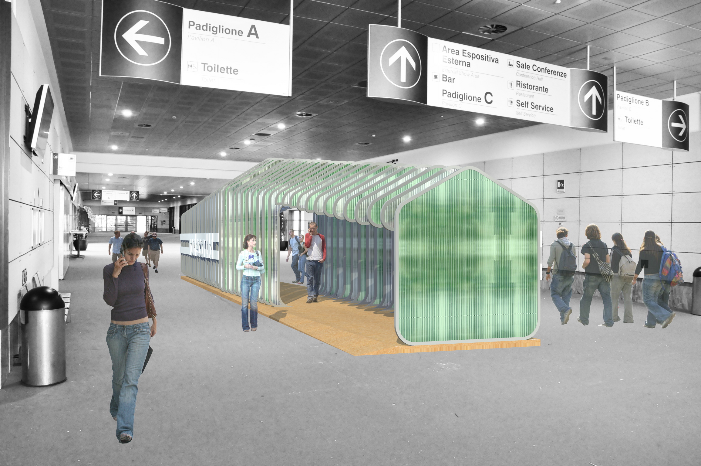 L’idea iniziale nasce dalla volontà di realizzare un’architettura che esprima sia semplicità espressiva, mediante l’utilizzo dell’archetipo della capanna, sia la carica innovativa del policarbonato Rodeca. Il volume progettato si sviluppa interamente nei limiti dell’area di progetto, valorizzandone la forma allungata, la quale ha consigliato di realizzare in un unico ambiente uno spazio permeabile, flessibile e fluido, accessibile da due direzioni che i visitatori possano percorrere ma in cui possano anche sostare. Il padiglione è un oggetto di dimensioni contenute, che, per la sua funzione, deve emergere ed essere visibile rispetto al contesto. Quindi il linguaggio scelto è teso a valorizzare la forma: scultoreo, senza però tralasciare la funzione. La forma di partenza è stata un parallelepipedo semplice, modellato tramite intrusioni ed estrusioni, dal quale sono state sottratte delle parti facendone emergere lo scheletro.