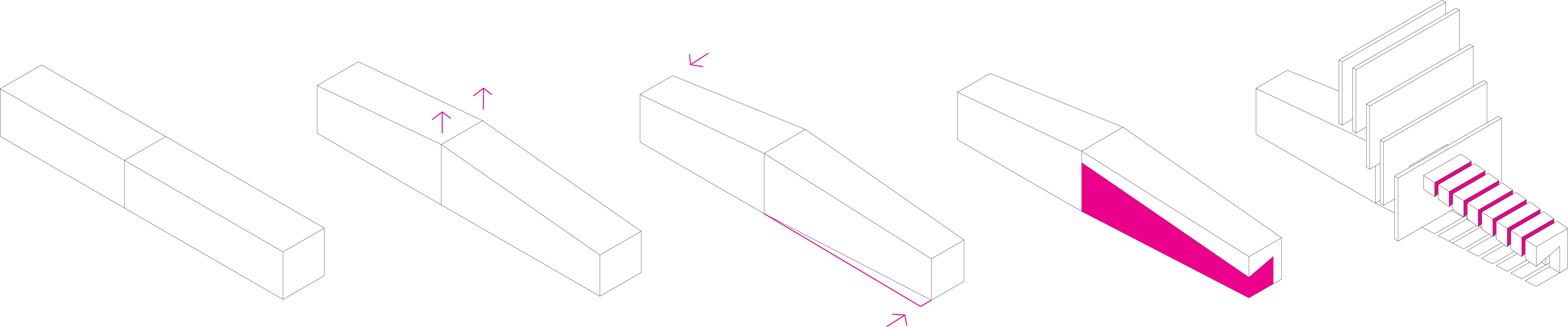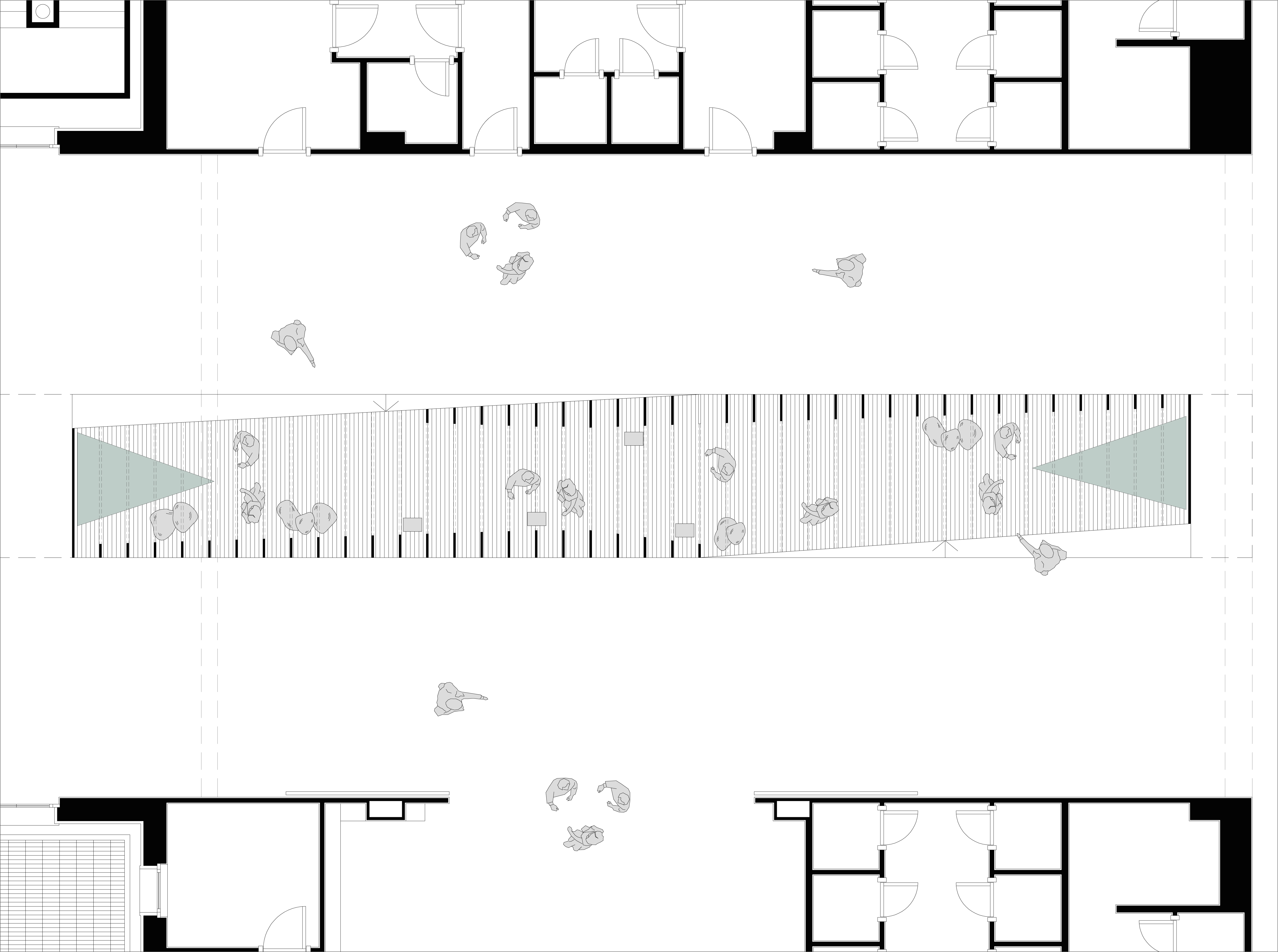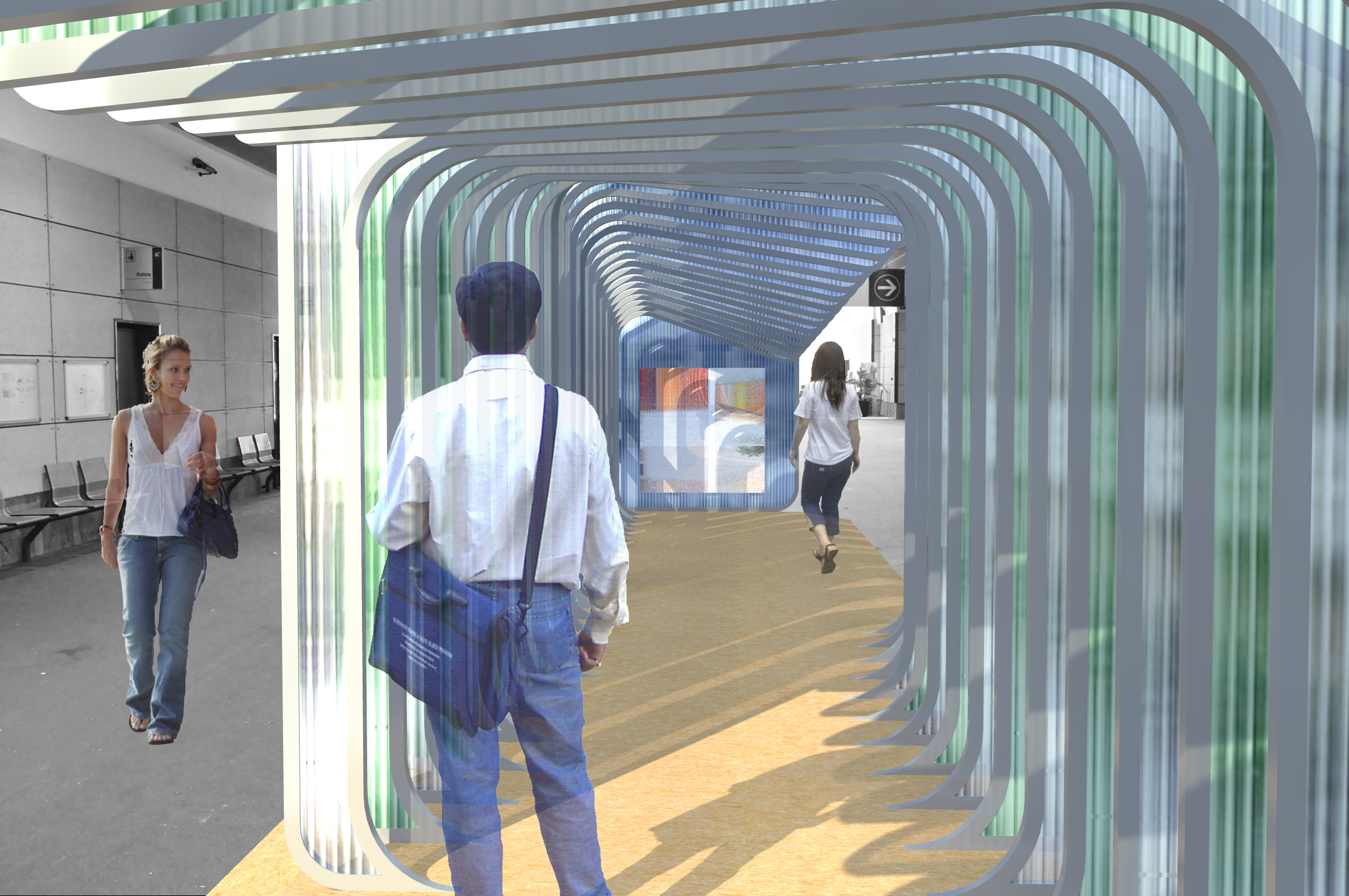 L’idea iniziale nasce dalla volontà di realizzare un’architettura che esprima sia semplicità espressiva, mediante l’utilizzo dell’archetipo della capanna, sia la carica innovativa del policarbonato Rodeca. Il volume progettato si sviluppa interamente nei limiti dell’area di progetto, valorizzandone la forma allungata, la quale ha consigliato di realizzare in un unico ambiente uno spazio permeabile, flessibile e fluido, accessibile da due direzioni che i visitatori possano percorrere ma in cui possano anche sostare. Il padiglione è un oggetto di dimensioni contenute, che, per la sua funzione, deve emergere ed essere visibile rispetto al contesto. Quindi il linguaggio scelto è teso a valorizzare la forma: scultoreo, senza però tralasciare la funzione. La forma di partenza è stata un parallelepipedo semplice, modellato tramite intrusioni ed estrusioni, dal quale sono state sottratte delle parti facendone emergere lo scheletro.